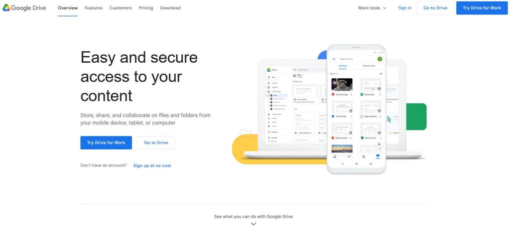 Google Drive enables freelancers and other online professionals to easily store, share, and collaborate on folders and files from their mobile device, computer, or tablet. Google Drive offers built-in protections against spam, malware, and ransomware, ensuring that your private documents remain safe.