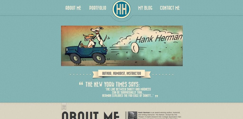 With its colored backdrop and cartoon graphics, Hank Herman hits it out of the park with his writing portfolio. Hermon’s writing portfolio website reflects his playful personality as a humor writer and showcases his long history of past works and professional writing services.