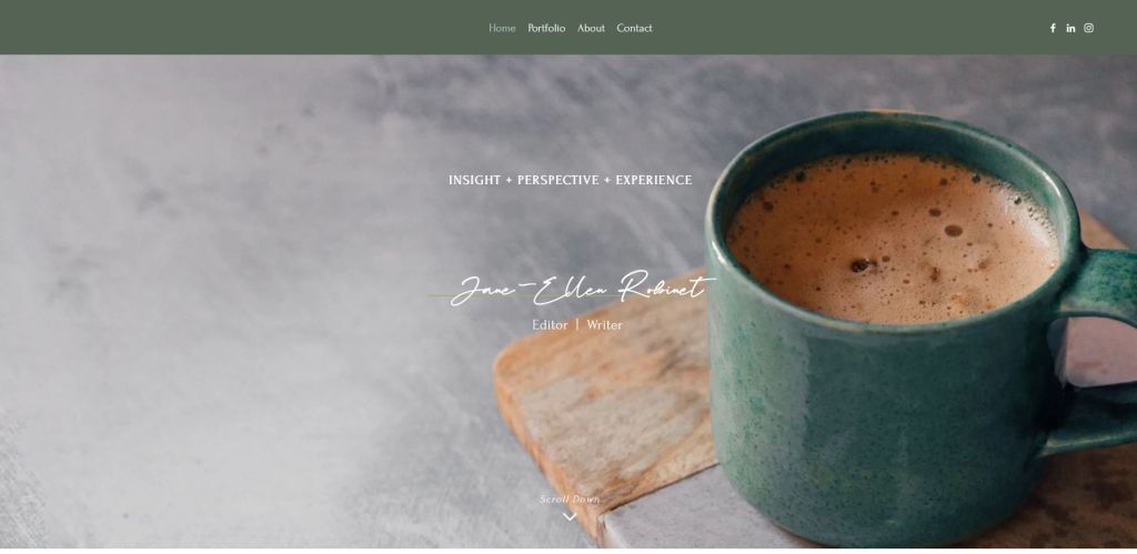 Many freelance writers are drawn to professional and sophisticated writing portfolios. Jane-Ellen Robinet delivers just that. The experienced writer and editor neatly displays her work across newspapers, magazines, and medical copy. She also provides a short bio and details her offerings in digital and print content writing and editing.
