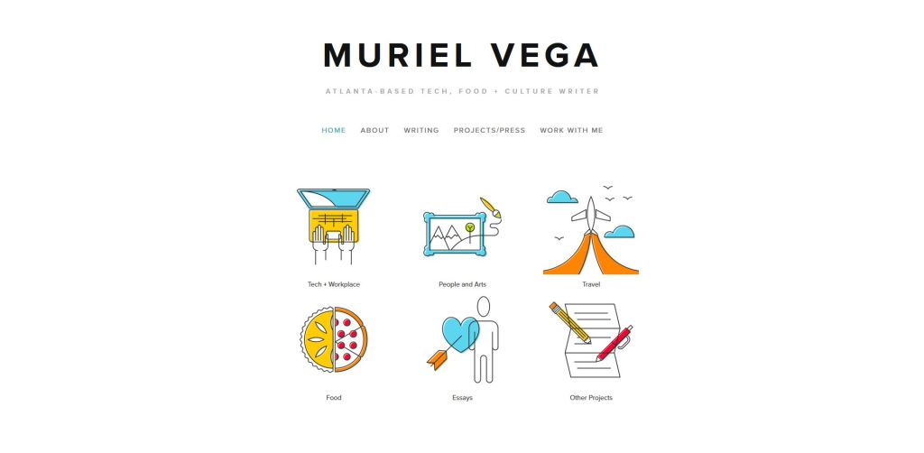 Muriel Vega is a writer and editor with bylines at The Guardian, Eater, Apartment Therapy, The Washington Post, and more. Her writing portfolio features colorful icons that represent the topics in which she specializes. The white background makes her portfolio appear clean and organized.
