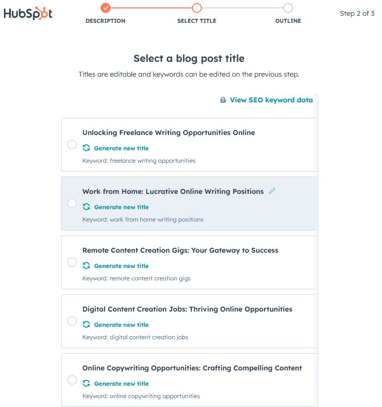 HubSpot also offers a free blog post title generator. However, this tool works a little differently than the previous mentions. Instead of entering a prompt or specific keyword, the platform asks what your blog post is about. It then uses the information to create a list of relevant blog titles. It also allows you to generate new titles and provides a list of related keywords. For the example below, I entered “online writing jobs.”