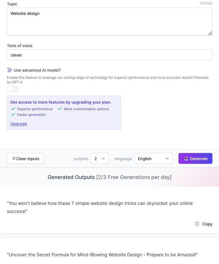 Need a fun or engaging clickbait title for your next blog post? Easy-Peasy.AI makes it easy to generate a title based on your specific needs. Just enter the topic and the tone of voice you’d like the blog writing to have, such as clever or catchy. You can also change the language and the number of outputs.