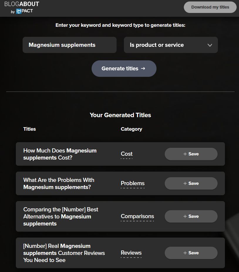 With Impact, you can create engaging blogs that resonate with your audience. It’s one of the easiest ways to build your content calendar and ensure that you always have a post ready to go. To use the Impact blog post generator, enter your keyword and select a “keyword type” from the drop-down list. For the following example, I entered “magnesium supplements” for the keyword and “Is product or service” for the keyword type.