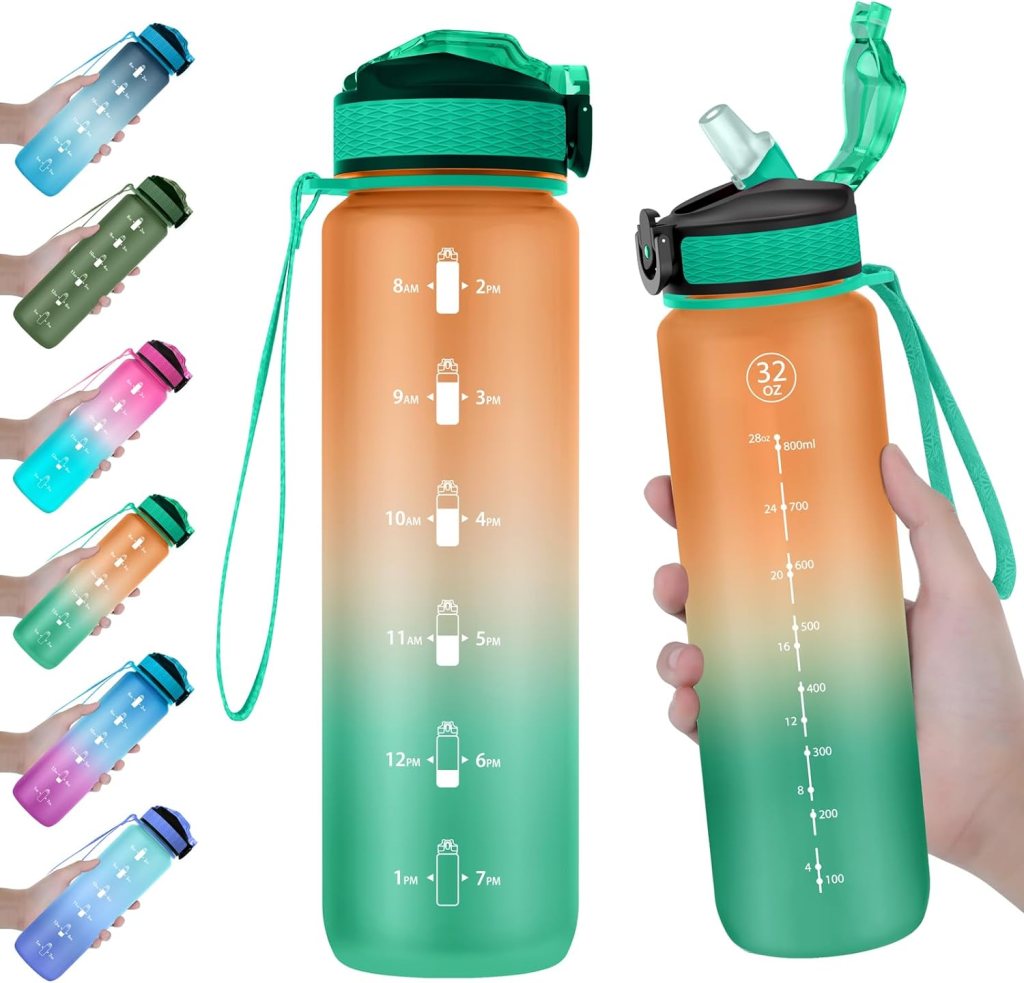 The EYQ 32 oz Water Bottle with Time Marker is a popular choice for its durability and convenience. This bottle features clear time markers on the side to help you monitor your hydration goals, and its insulated design keeps beverages cold for hours. It’s perfect for staying hydrated while working from home or on the go.