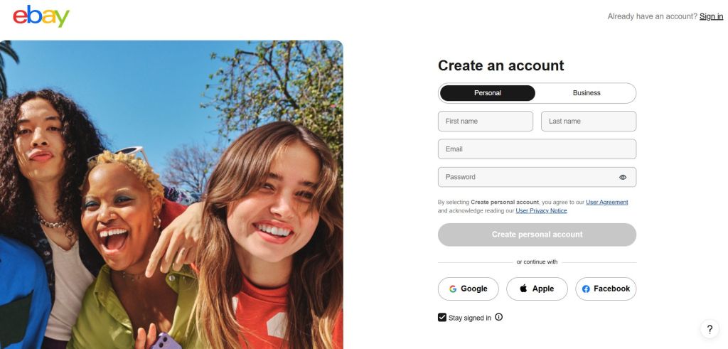 If you don’t already have an eBay account, getting started is simple. Start by choosing between a Personal and Business account. Most new sellers start with a personal account, which is perfectly fine, even if you plan to grow over time. You can always convert to a business account later if needed.