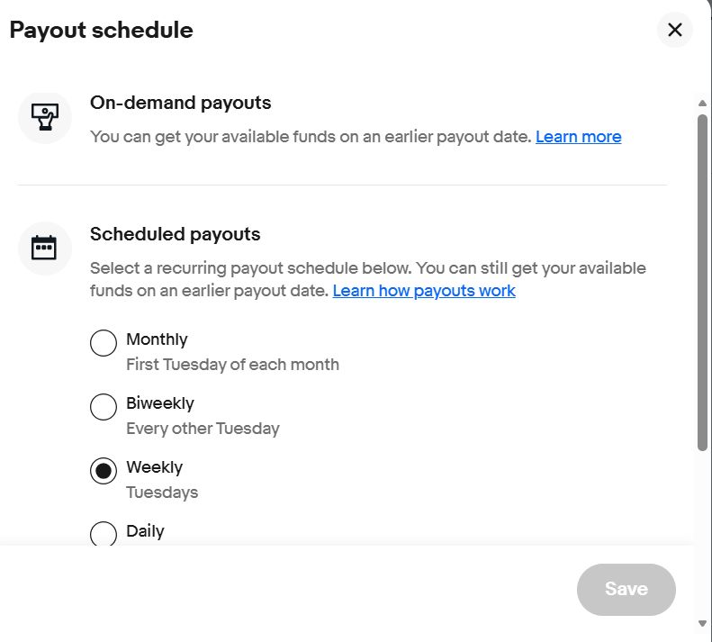 You’ll then want to choose how often you get paid. As the name suggests, “On-demand payouts” allow you to gain access to your money sooner. You can request funds at any time, as long as they’re not on hold. Once the transaction is initiated, you should receive your money within 1 to 3 business days.
